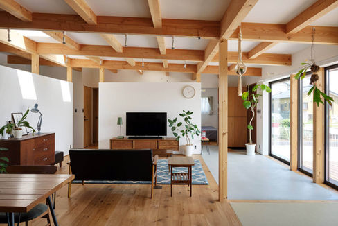 静かな田園に囲まれた敷地。南に開かれた景色が印象的で、空の広さや風の流れなど、既存の自然環境と対話でき、建築と人が有機的に繋がる空間を目指した。水平が強調されるような外観は周辺の景色と調和するデザインとし、長く伸びた軒先は自然と家族を迎え入れるように仕掛けた。平面はシンプルな4間x8間の矩形とし、極力屋根面を低く設定することで碁盤目状の構造現しとなった天井への意識を高め、居心地の良いヒューマンスケールを作り出す。リビングは開け放つことができる開口部で、外部と一体になったような空間を実現した。そこに家具、雑貨や植物などが彩られ、建築、生活、自然の関係性を整えた。計画当初ご家族から頂いた数十枚もの参考写真があったが、同じように、完成した空間から切り取られた日々が幾重にもなり、家族の大切なアルバムのようになってもらいたい。そして大きな空と伸びやかな屋根の下で、寄り添いながら成長する家族を見守っていってほしい。