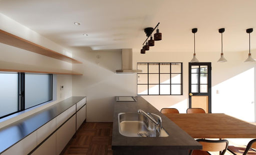 ご夫婦と3人の息子さん達のための建替え計画。独立したダイニングキッチン、リビングと繋がる書斎、将来3部屋に別けられる子供室、ワンちゃんの過ごせる土間、庭で遊んでいても安全でプライバシーも保たれる塀、駐輪場等をご希望された。1階の東西を1間幅の玄関、納戸、洗面、浴室、パントリー等により挟む事で周囲の喧騒から守られ、構造的にも自由度が高く南北に風の抜けるLDK空間を提供した。同じ広さのリビングとダイニングキッチンは高さを思い切り変える事で変化を持たせた。リビングは2重になった階段や、書斎、様々な窓を通して家族に囲まれる空間としている。黒い鉄とヘリンボーンやダブルスクエアとした床等、木を多用し、丁寧な手作業で精度を高めたディテールに溢れる住宅となった。