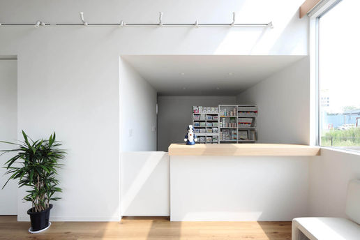 交通量の多い幹線道路沿いの敷地で建築としての魅力を引き出せるかが課題となった。商業エリアではあるが周辺は比較的開放されており採光を確保するにも最適な場であり、建物を看板として機能させる重要性があった。緑町という土地から山をモチーフにし、南側を待合としても開放できる広いドッグラン、北側を診療所として利用する計画とした。エントランスから待合室に入ると2層分の吹き抜けとなっており、ドッグランとも隣接させ、人、動物たちを迎え入れる上でゆったりと、どこか自然な環境におかれるような内部空間を与えた。個室は動線計画に配慮して最短距離でスタッフが働ける環境とした。2階は事務室やスタッフルーム、トリミングも経営できるスペースを設けている。敷地は元々鰻屋が建っており、長く地元に親しまれていたお店でもあった。当建築も幹線道路沿いの景観にとって良い影響を与え、永く、多くの動物たちを見守る病院であってくれればと心から思う。