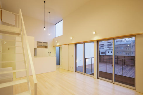 めぐり逢いのテラスを持つ二世帯住宅 熊谷駅から徒歩数分、長年この地に住まわれてきたご家族の住宅建替計画である。39坪の土地に二世帯分の住居と駐車場、庭の代わりとなる大きなテラスが求められた。ガレージ屋根をテラスとし、その余白に住居を配置。1階をご両親、2階をご夫婦、3階をお子さんのフロアとした。ガレージは壁もデッキ材で覆われピッチを調節する事で1階にも光と風を取込み、2階ではテラスがLDKと繋がり広さを演出し、各階において通りからの視線を遮っている。スキマを持ち立体的に立ち上がるテラスが二世帯を繋ぎご家族の交流をはかる欠かす事の出来ない場となっている。
