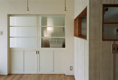 アンティーク建材に囲まれたカフェリビング お洒落な喫茶店を巡るご趣味を持つ夫婦のための住宅。ご夫婦が使用する古材や建具を選定し、我々が設計に落とし込み入念に空間を作りこんだ。ご主人拘りの書斎と繋がるリビングは3.5m以上開放出来る木サッシを持ち、その前にベンチにもステップにもなるカウンターを設置した。座って庭を眺めたり、そのまま階段のように外に出られる。2階の縁側は寝室環境を安定させるバッファゾーンとなり、1階からは吹抜けのように感じる強化ガラスの床が光を落とす。1階は雰囲気を出すため施主と我々で漆喰を塗りラフに仕上げている。設計の半分を施主が行ったような我々としても挑戦の多い作品となった。