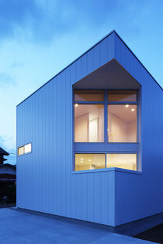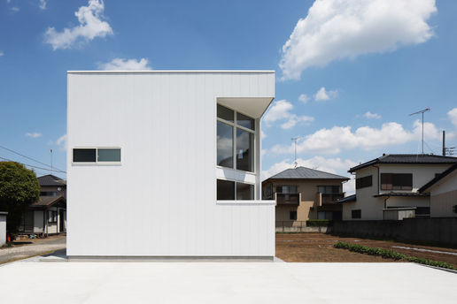 切り欠く事で産まれる協調性と強調性 ご夫婦と2人の息子さん4人の住まい。敷地は南に対して45°振って道路に接している。周囲から干渉されないリビング、キッチンに隣接する畳スペース、南向きの子供部屋、書斎等が求められた。向かいには教会が建ち不特定多数の人が集まる為、プライバシーを保ちながらも明るく落ち着いて過ごせる空間を目指した。正方形平面を周囲建築と同じ向きに配置し、南の一角を切り欠き開口とした。1階は視線を遮る高さまで外壁を立上げ小さなテラスを設け、2階は切り欠いた面を分け合うように子供室を配し南採光を確保している。予算から各居室を必要最低限の広さとした26坪の総2階は一角を大胆に切り欠く事で要件を満たしながら、この敷地に応え、建築内外にそっと特異性を持たせている。