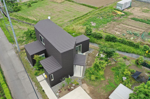 群馬県伊勢崎市の郊外に建つこの住宅は、三世代が共に暮らすことを前提に計画された。中心に据えられたLDKから各室が放射状に伸びるような構成とすることで、LDKが単なる通過動線として機能するのではなく、家族の気配を自然と感じ合える交流の核としての役割を持たせた。LDKには南北両側に吹き抜けを設け、光と風が抜ける開放的な空間となるように計画し、視線の奥行きも意識されている。窓の配置においては、南側に設けた庭へと視線が落ち着くよう低めの開口部を取り、北側には空を見上げるような大きな窓を多角的に配置することで、外とのつながりを多様に確保した。建物を上空から見ると、風車のような独特な形状が現れ、凹凸のある構成が周囲の風や光を巧みに取り込み、季節の変化とともに、家族の豊かな暮らしを育んでいくことを意図している。年月を重ねるごとに、この家がさらに家族に寄り添い、それぞれの世代が自分の居場所を見出しながら、日々の営みが穏やかに紡がれていくことを願っている。