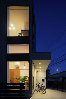 縦横の抜けがもたらす、繋がりと陽光を感じる住まい 白岡市内に計画された夫婦と息子さん3人の為の住宅。敷地は角地で隣接する北側の土地も駐車場や庭として利用するため購入している。南北が通りの多い道路と庭や田畑に挟まれたこの地で、視線の抜けと程よく明るさを感じる住まいを目指した。建物中心に高さ6mの玄関ホールを設け、北側の庭に視線が抜ける空間とする。LDKとホールは収納で仕切り上部をガラスとすることで、北側のダイニングキッチンにも吹抜から間接的に光が差し込むだけでなく、上下階の視線をつなぐ役割も果たす。中心に螺旋階段を配置しスキップフロアで構成した書斎や居室とすることで程よく家族の存在を感じることができる。水平・垂直方向に抜けを意識し形作ることで空間の豊かさだけでなく、住む人の心も満たす住まいとなった。