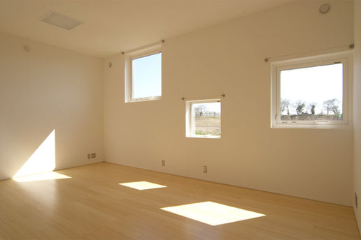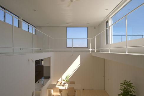 厳しい自然から守り美しい自然を楽しむ住宅 群馬県の夏の暑さや冬の強風、交通量の多い北側の国道と厳しい自然に囲まれた敷地は60センチ程の高低差があり、南側の桜並木は散歩道になっている。私達は段差をそのまま利用し造成費を抑え、外気や騒音、視線から守られた場を創造出来ないかと考えた。個室を納めた南の箱を下げる事で北の箱上部に大窓を設け、北側にありながらも明るく守られたLDK空間とした。1階からは空を眺め、2階からは30畳あるテラスの先に満開の桜を楽しむ。風の強い北・西の窓は極力なくし、夏の日差しは内部廊下が庇の役割を果たす。建築がない頃、我々は穴の中で暮らし自然から身を守った、そんな根源的な安心感がこの家にはある。